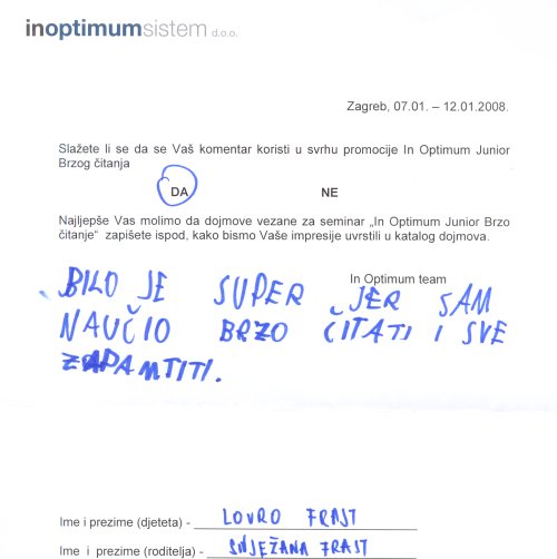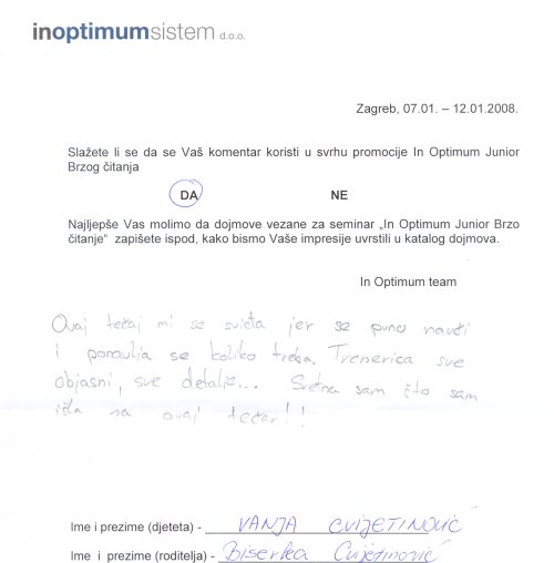 Kada vidimo svoje dijete kako oduševljeno priča o Vašem programu BRZOG ČITANJA i naučenom sadržaju, sretni smo što je pohađao Vaš seminar.