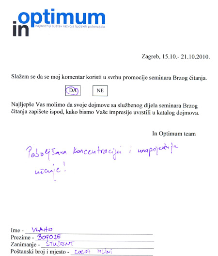 Ovo su utisci polaznika seminara Ultra brzo čitanje iz Zagreba od 15.10. – 21.10.2010. Zbog lakše čitljivosti tekst je prepisan iz njihovih autentičnih utisaka koje možete vidjeti niže na ovoj stranici.