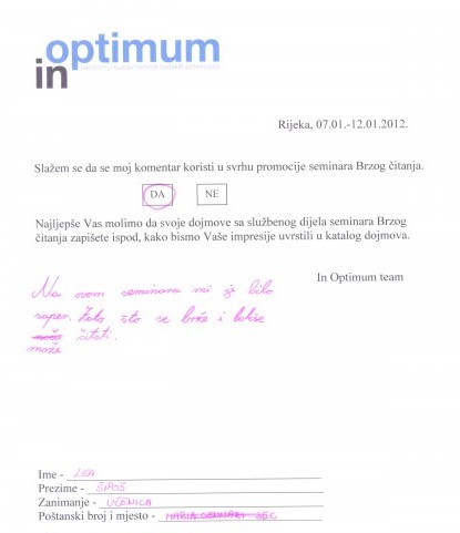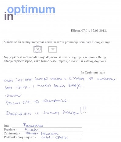 Bilo je fenomenalno. Nisam vjerovala da ću moći tako brzo čitati kao što sada – nakon ovog seminara. U početku nisam željela ići, ali mi je jako drago što sam otišla. I što mogu čitati ovako brzo kao što sada znam.