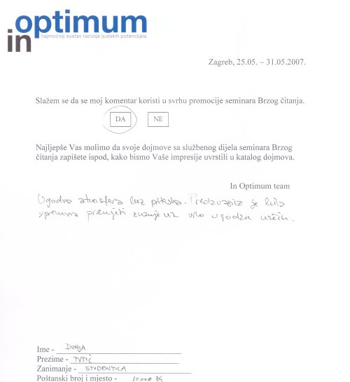 Zahvaljujem In Optimum-u i izuzetno kvalitetnom predavaču Viktoru, na otvaranju novih mogućnosti napredovanja. Moram na kraju priznati na svoju veliku sreću da brzo čitanje stvarno funkcionira. Hvala na 7 ugodno i korisno provedenih dana. Vidimo se!
