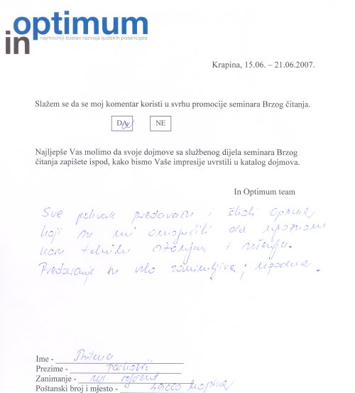 Sve pohvale predavaču i školi In Optimum koji su mi omogućili da upoznam novu tehniku čitanja i učenja. Predavanja su vrlo zanimljiva, ugodna.