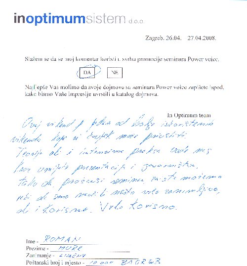 Ovo su utisci polaznika seminara Power Voice od 26.04. – 27.04.2008. Zbog lakše čitljivosti tekst je prepisan iz njihovih autentičnih utisaka koje možete vidjeti niže na ovoj stranici.