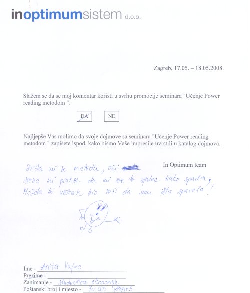 Ovo su utisci polaznika seminara Učenje Power Reading metodom od 17.05. – 18.05.2008. Zbog lakše čitljivosti tekst je prepisan iz njihovih autentičnih utisaka koje možete vidjeti niže na ovoj stranici.